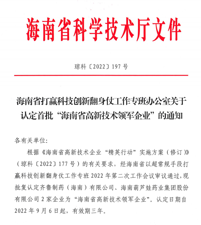 近日,海南省科学技术厅发布的《海南省打赢科技创新翻身仗工作专班办公室关于认定首批“海南省高新技术领军企业”的通知》中显示,批复认定海南人生就是博药业集团股份有限公司等2家企业为“海南省高新技术领军企业”。认定日期自2022年9月6日起,有效期三年。